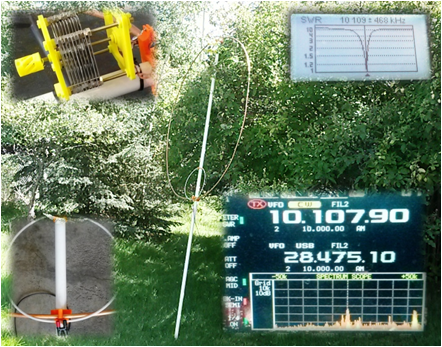 The picture above shows the modified butterfly capacitor on the top left, and the new feed loop on the bottom left. Then, I tuned the loop to 10.109 MHz by hand adjusting the capacitor. The loop tuned up nicely, as shown in the graph at the top right. The magnetic loop is a very narrowband antenna – whenever you change frequency by any appreciable amount, you need to retune.