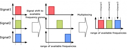 Multiple voice signals were frequency shifted and then combined into a band between between 60 to 108 kHz. Each voice signal was single sideband superimposed on a carrier signal. Soon, sending 12 SSB voice channels simultaneously became common. By the 1930’s this increased to 24, and so on.