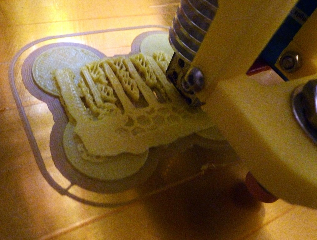 You can also see the small brim that I have printed around the part on the first layer. Together, the brim and the four anti-warping pads provide a large surface area of adhesion to the print bed. This prevents warping at the edges. Thanks to fellow Canadian Claude Theroux who made my life easier by posting models for the anti-warping disks on Thingiverse.